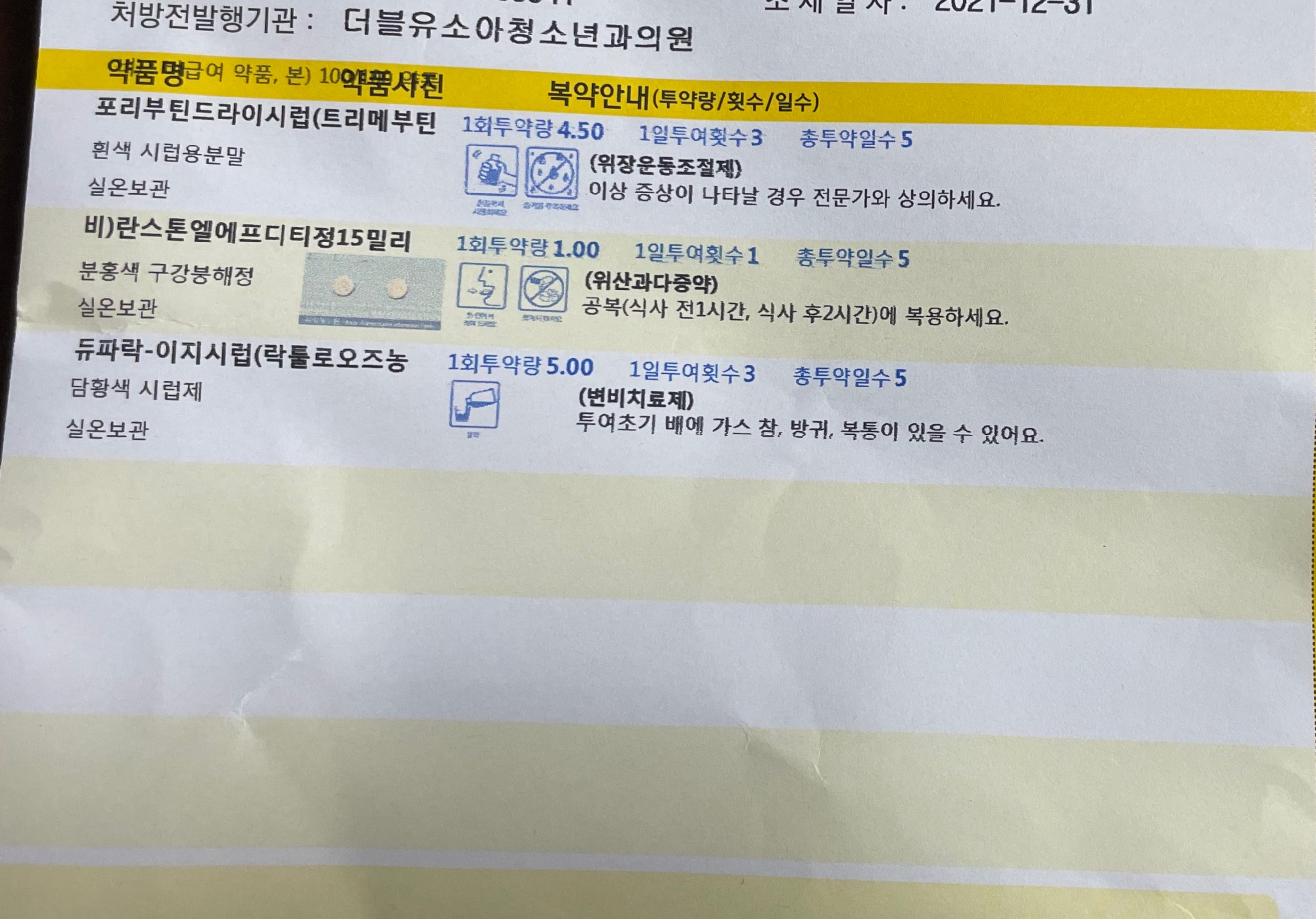 약은 위장운동조절제(포리부틴드라이시럽), 변비치료제(듀파락), 위산과다증약(란스톤엘에프디티정 15미리)를 받아왔다.