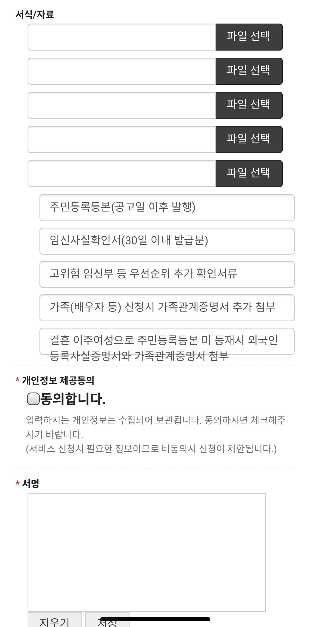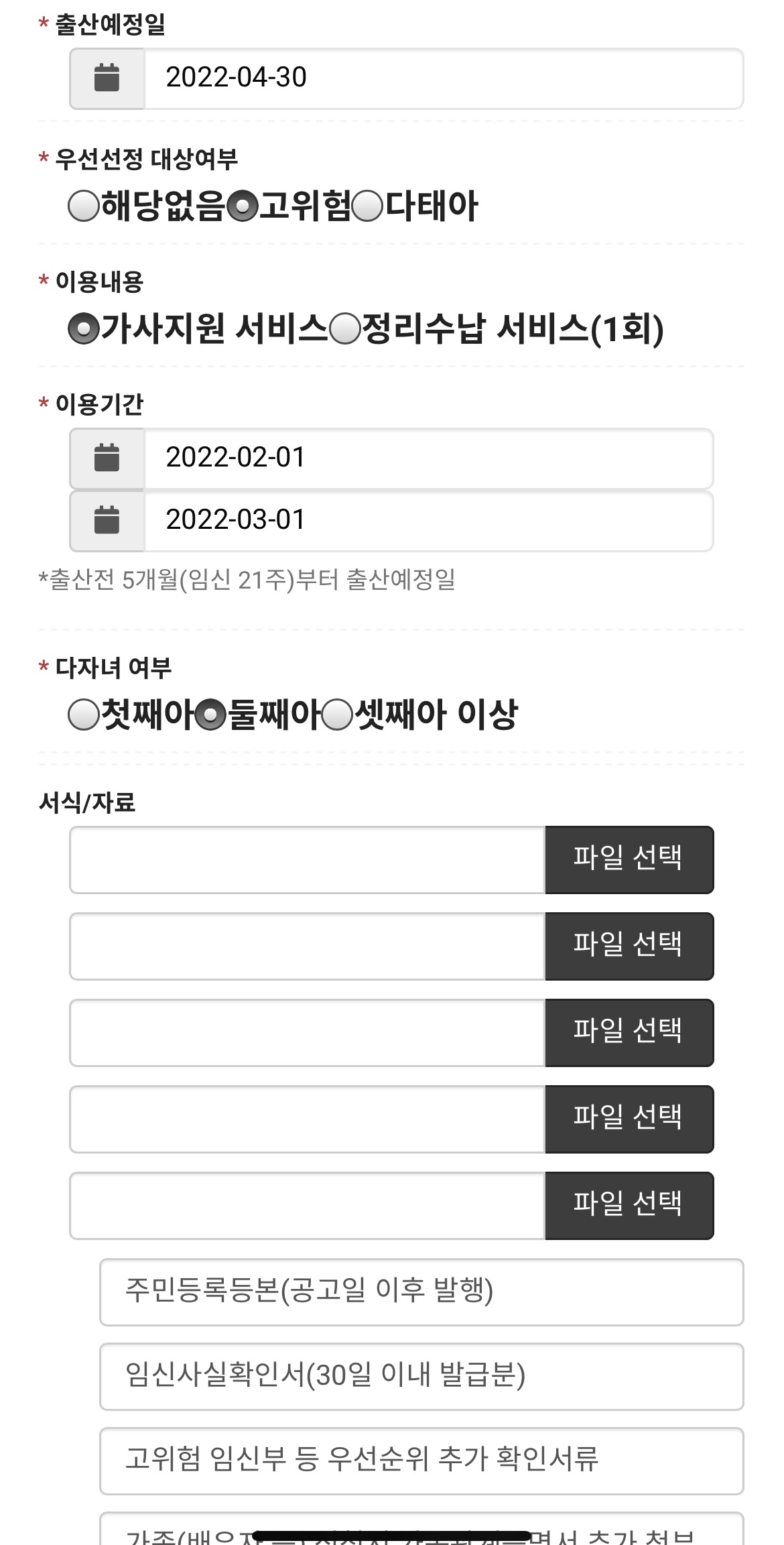 구비서류: 주민등록등본, 임신확인서, 고위험이나 다태아의 경우 증명할 수 있는 서류(신청자 초과시 우선순위),