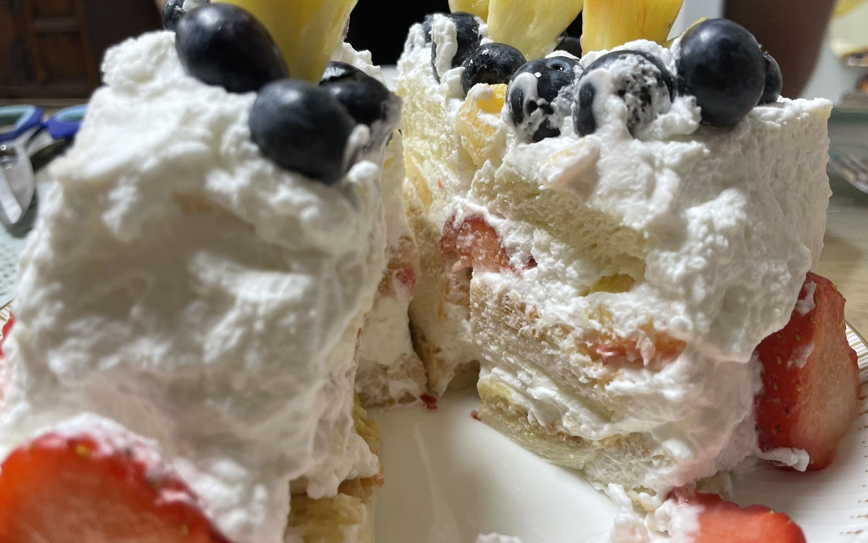 시럽을 바른 빵 위에 크림을 바르고 과일 올리고 그 위해 크림 한겹 더. 그 위에 빵을 또 올려서 반복.
