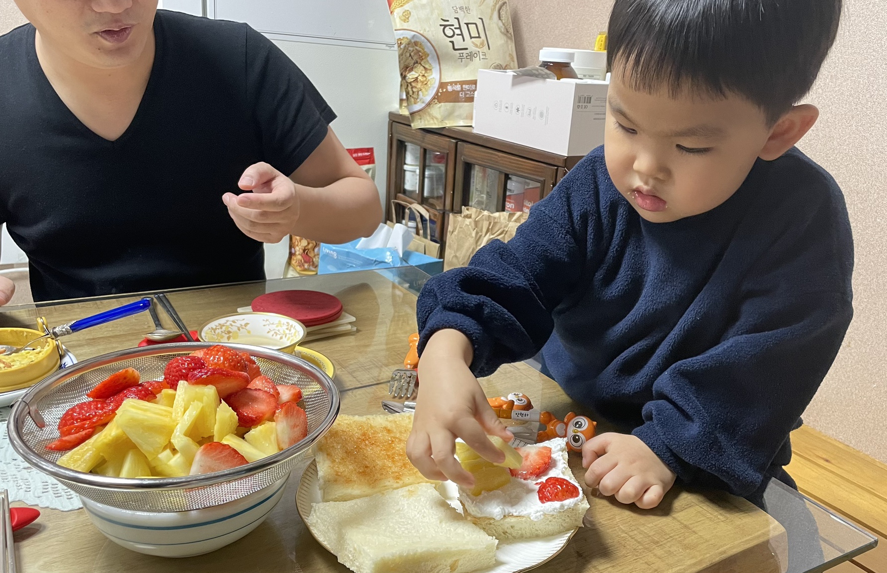 준비물: 식빵 3조각, 휘핑크림 500ml(+스테비아 아빠 숟가락으로 1.5숟가락), 시럽 조금(묽은 잼이나 청 등으로 대체 가능), 원하는 과일(딸기, 파인애플, 블루베리)