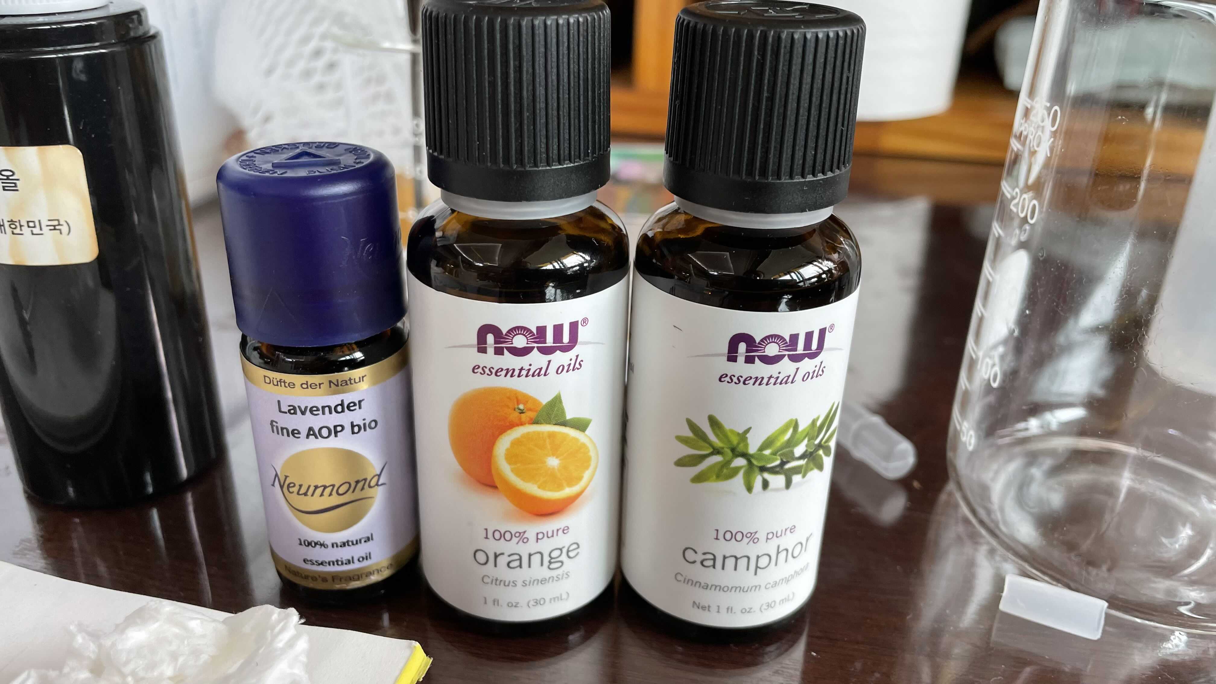 그래서 오렌지 오일을 꺼내고 어울릴만한 캠퍼도 꺼내는데 당당이가 보라색 뚜껑도 하고 싶다고 해서 라벤더도 꺼냈다.